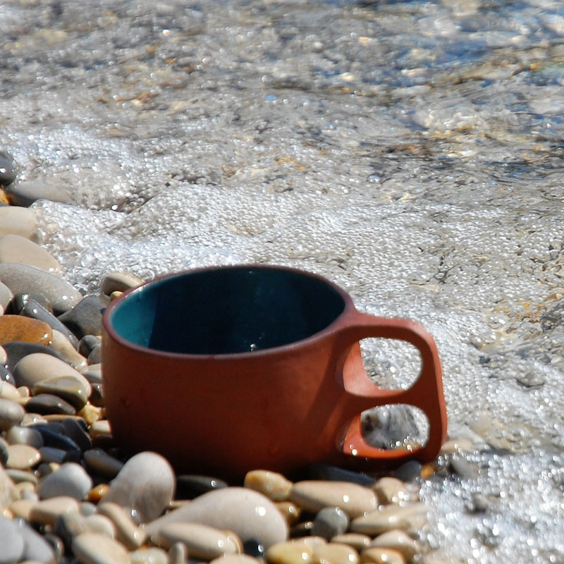 An unique coffee mug with a rounded shape of the iconic ithaka handle.